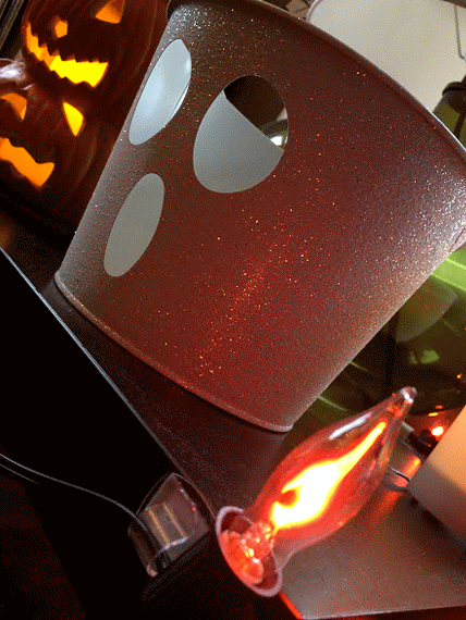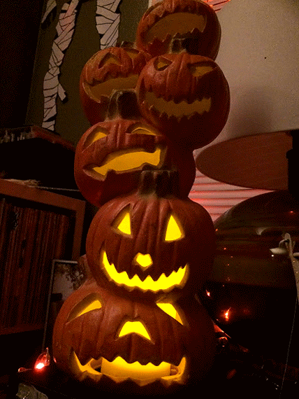 I would also mention that many of the “electronic” candles that you can get in most stores have “timer” settings, where the light is on for five hours, and off for 19. (Some have even further settings to fine tune these times.) These can work really well to accent parts of the room, or light the inside of other decorations (like our stack of pumpkins). Lastly, I have all of my lights on one switch in the living room, so I don’t even have to go outside to turn everything off. I recommend this for anyone who wants to set up decorations. I used to just plug things in where ever I could, and really thought I wouldn’t mind going out to unplug things. Being able to shut it down with one switch is quite a luxury.