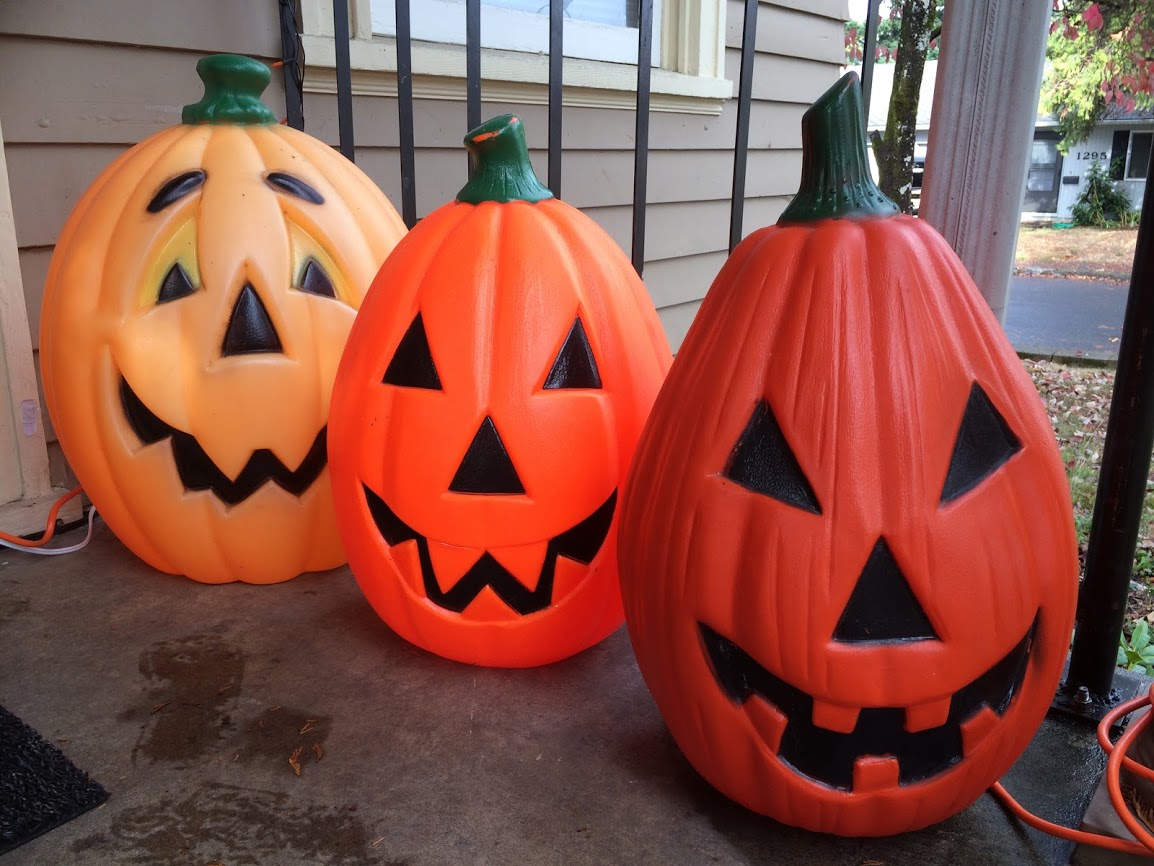 My wife and I are fond of vintage blowmolds, and every time we’ve found one it’s been worth buying, no matter where you find them. Patience has paid off, and we have found four incredible pumpkins at various thrift stores. Each of these are designed to insert a light that plugs in, creating the effect that the entire plastic item is lighting up (you can see them in action in the video). These things are really awesome, and we get excited when we can put them out. As you can see, the biggest one is clearly sun-damaged with age, but the others are pretty fantastic. We’re hoping that we can find more to flesh out our entire porch as the years go on.