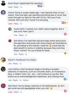 I’ve been experimenting with my “reactions” here on FB, hoping to add a little more ooomph to my interactions. Mostly, this has taken the form of using the “Love” reaction more than just the “Like.”