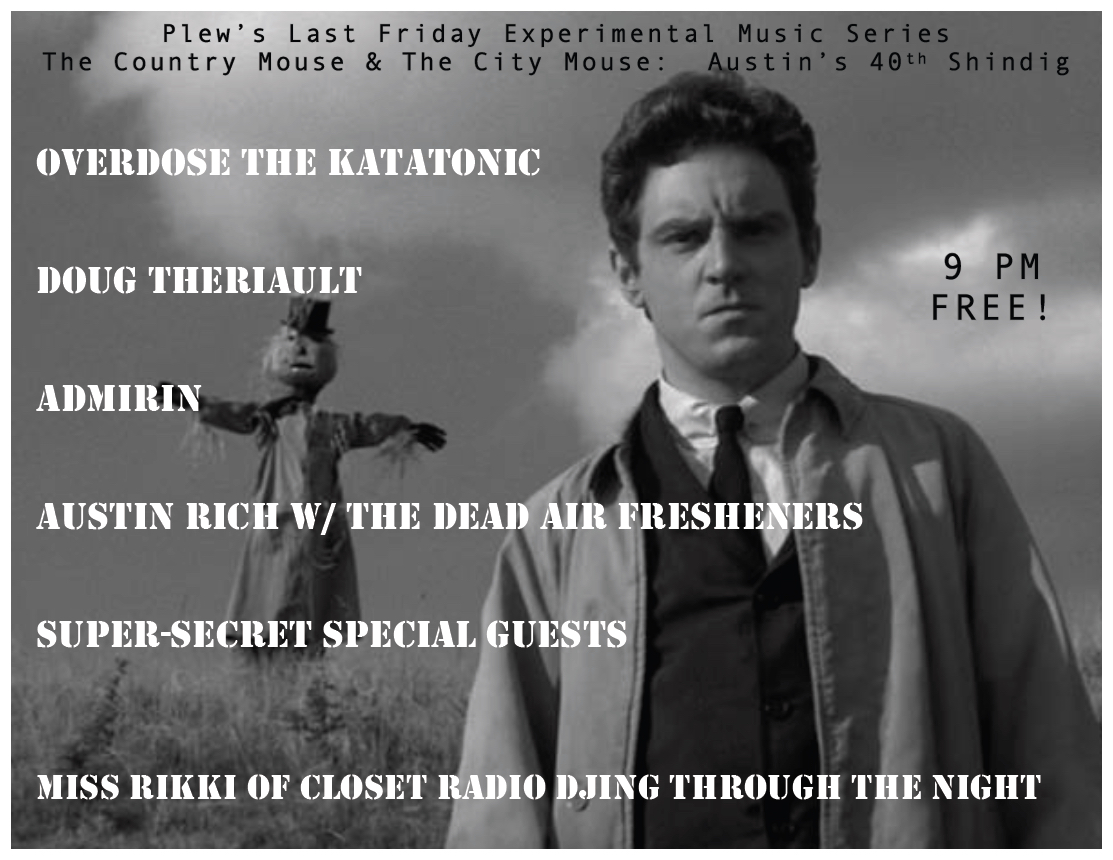 Of course, as it is my birthday, I get to do what I want, and this time I’ve asked to perform live with The Dead Air Fresheners at this show. While I am occasionally invited to perform live with them as a member of their mysterious group, this performance will be a sequel to our show from 2013, where they will be backing me as I deliver a spoken word piece titled “The Country Mouse & The City Mouse.” I always enjoy working with these guys, and I’m hoping that this performance will merge our aesthetics in a way that you’ll have to see to believe.