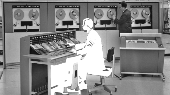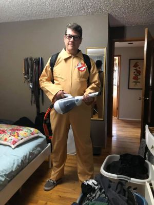 A simple Ghostbuster getting ready for work while his Rajneeshee wife stays home. (1984, colorized.)