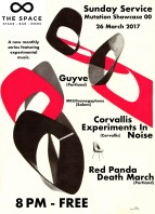 Corvallis Experiments In Noise, Red Panda Death March, Guyve & MKUltramegaphone. This was the first show in a series of “Sunday Service” shows The Space Hosted for most of 2017.