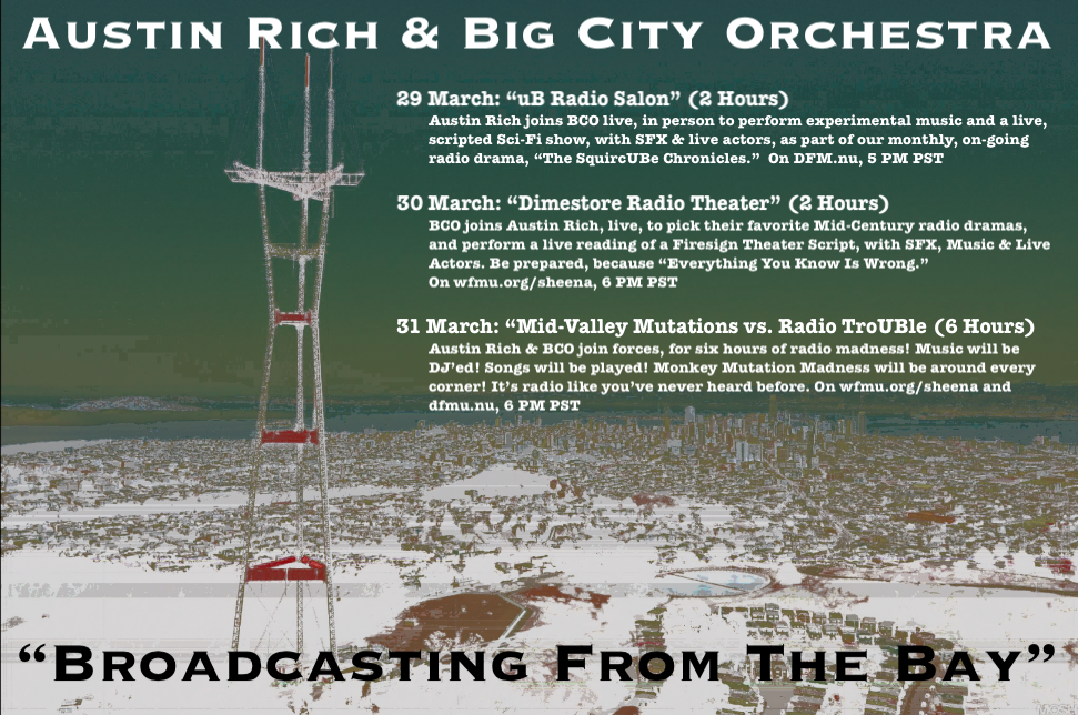 Live on uB Radio Salon on DFM.nu. Last Sundays, 5 PM – 7 PM PST. Austin writes an ongoing monthly, scripted Experimental Sci-Fi comedy with univac and Big City Orchestra. Known as “The SquircUBe Chronicles,” that show is performed with live sound effects, music, and voice actors reading the parts.