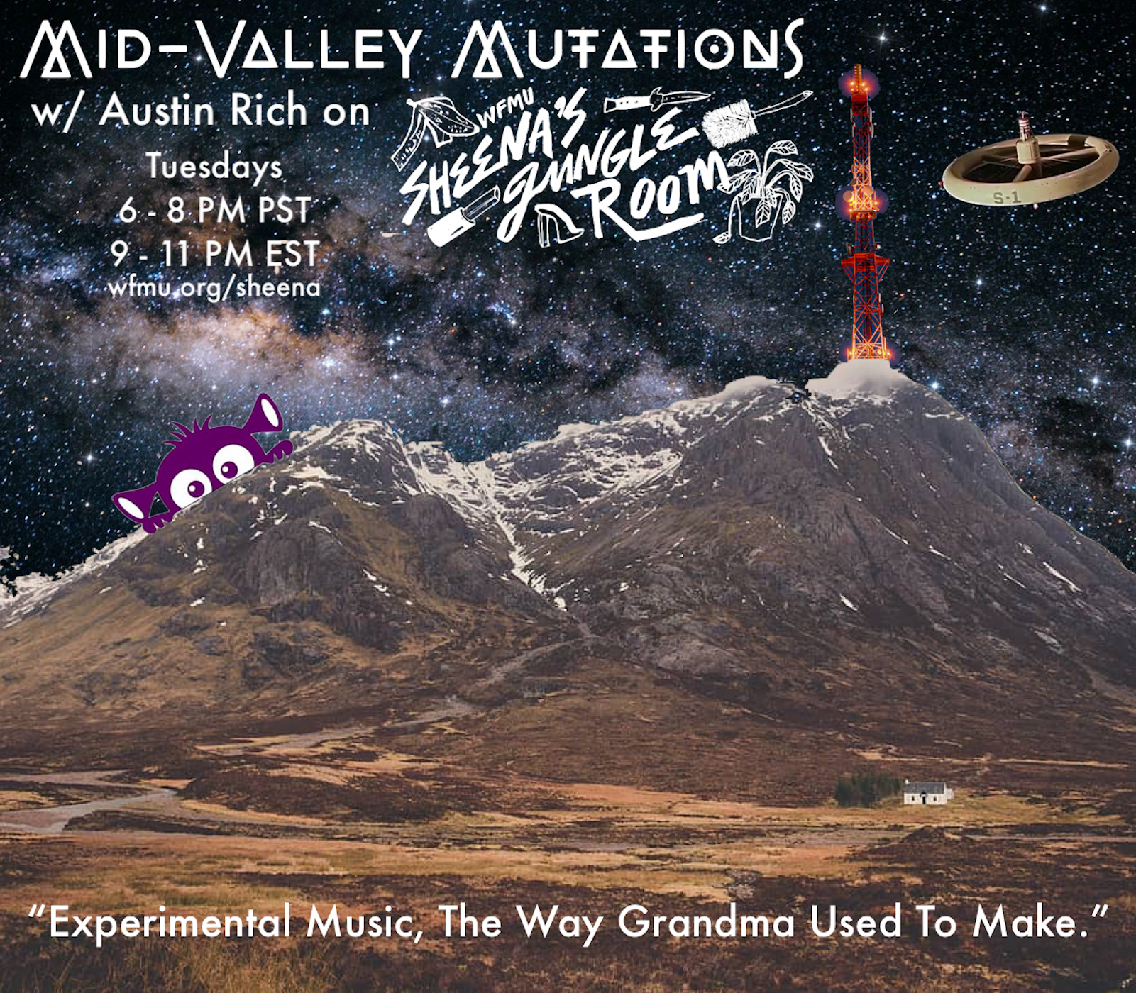 Live on Mid-Valley Mutations on Sheena’s Jungle Room / WFMU. Tuesdays, 6 – 9 PM PST. Every week, live electronic music / collage performed by Austin Rich & Mini-Mutations.