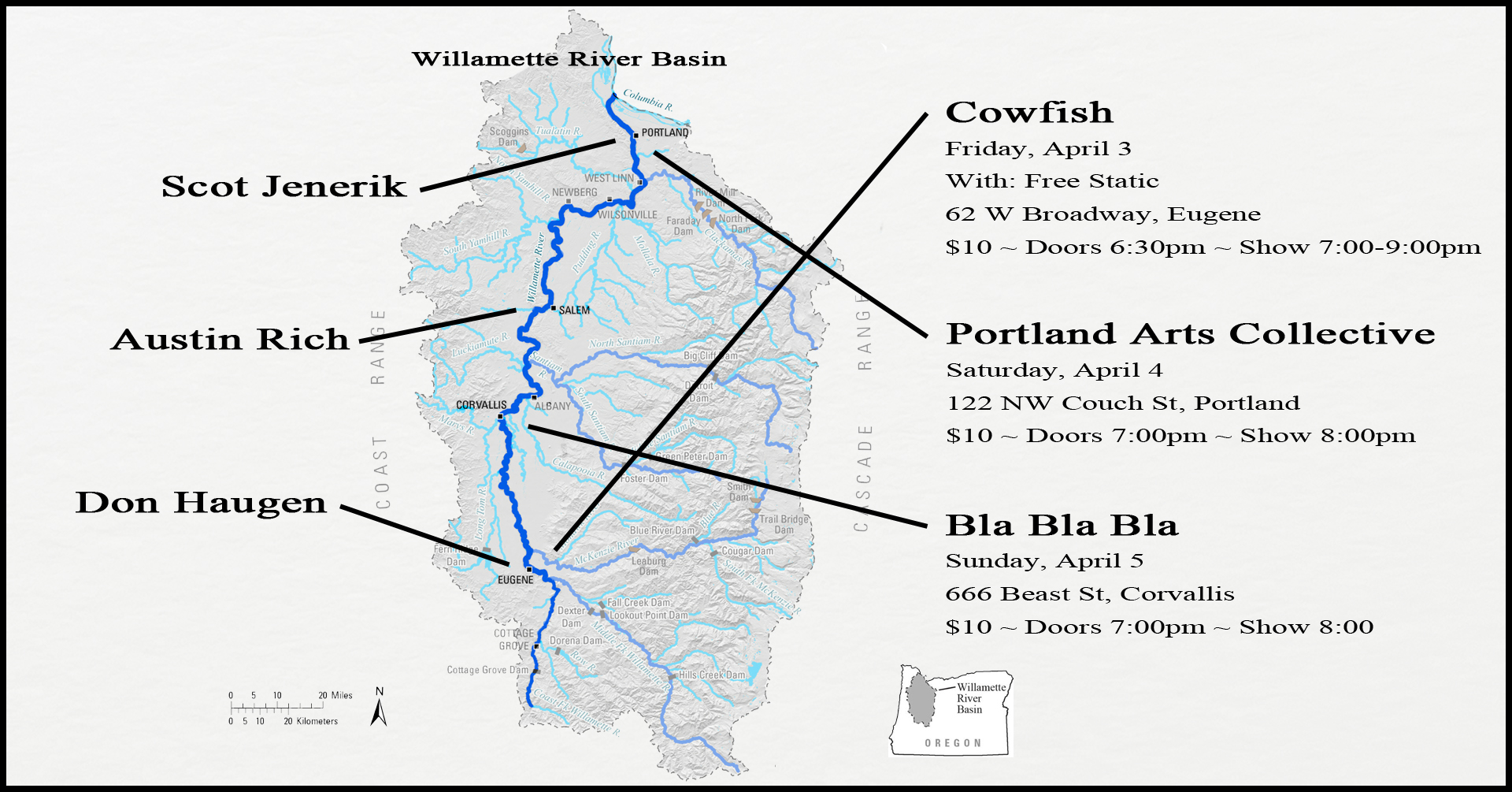 3 April: Live Performance with Scot Jenerik & Don Haugen & Free Static at The Cowfish in Eugene, OR at 7 PM.