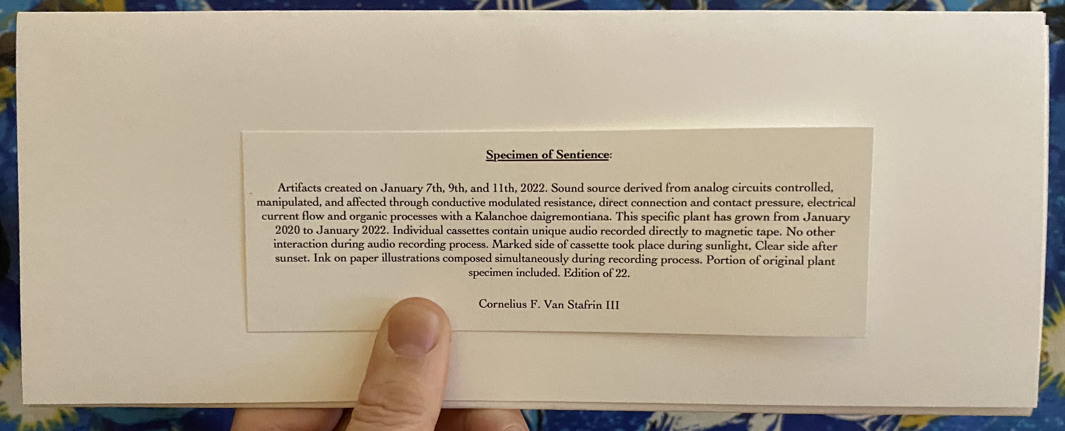 While we might have received this a little late, all things considered, our January release is by none other than Cornelius F. Van Stafrin III, who delivered one of my favorite releases of 2021, and has upped the game this year with 20 minutes of new compositions, that came packaged with a plant! Cornelius is always producing incredible work, and the sounds on the tape are nothing short of what you would expect: beautiful, textured drones that evoke time and place very vividly. And excellent start to the 2022 line-up!